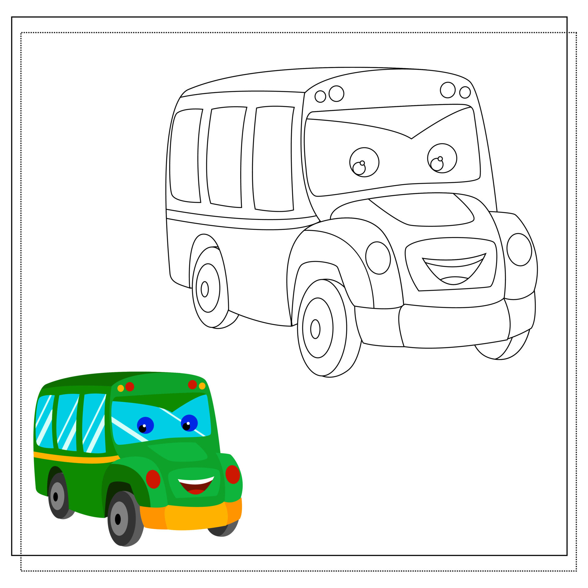 A Cute Cartoon Bus Coloring Book With Eyes And A Smile Sketch And Color Version 7075000 Vector Art At Vecteezy